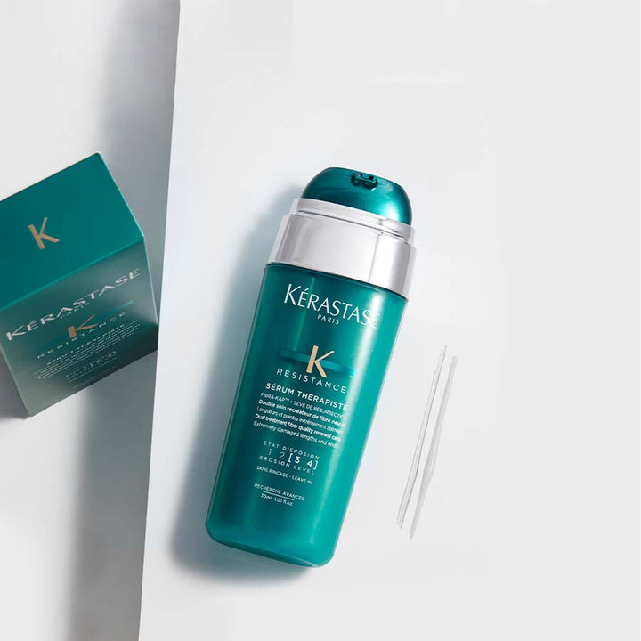 Sérum Thérapiste është një serum për flokë shumë të dëmtuar dhe të mbi-përpunuar, që riparon menjëherë fibrën e flokëve duke e përforcuar dhe mbrojtur nga dëmtimet e nxehtësisë dhe majat e çara. Ky produkt unik ofron termo-mbrojtje deri në 230°C*, duke e bërë atë zgjedhjen e përsosur për të mbrojtur flokët gjatë stilimit me nxehtësi. Formula e tij kombinon një krem riparues dhe një serum lidhës, që ndihmojnë në riparimin e fibrës, forcimin dhe zbutjen e sipërfaqes së flokëve. Sérum Thérapiste përshpejton tharjen, shton butësi dhe mbyll majat për të parandaluar ndarjen e tyre.