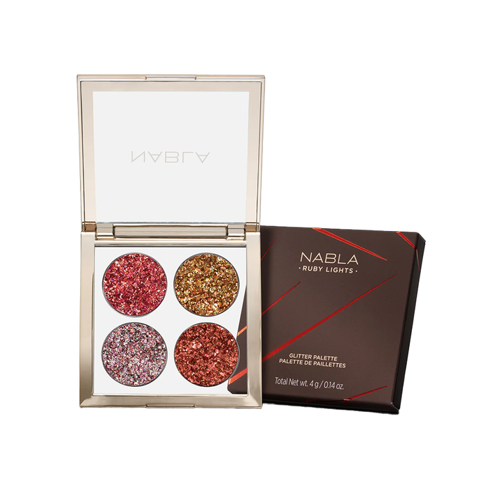 💎 Ruby Lights Glitter Palette është një paletë unike me 4 tone të magjishme, plot shkëlqim magnetik dhe reflektime kameleonike. Drita shpërbëhet dhe shndërrohet në nuanca të thella dhe të çmuara të kuqes dhe floririt, si një thesar rubini që ndriçon në errësirë.