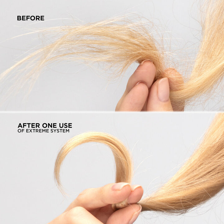 💡 Këshillë: Përdorni të gjithë sistemin Extreme për të rivendosur forcën dhe shëndetin e flokëve të dëmtuar, duke reduktuar ndjeshëm thyerjen dhe dëmtimet e shkaktuara nga stilimi dhe trajtimet kimike.