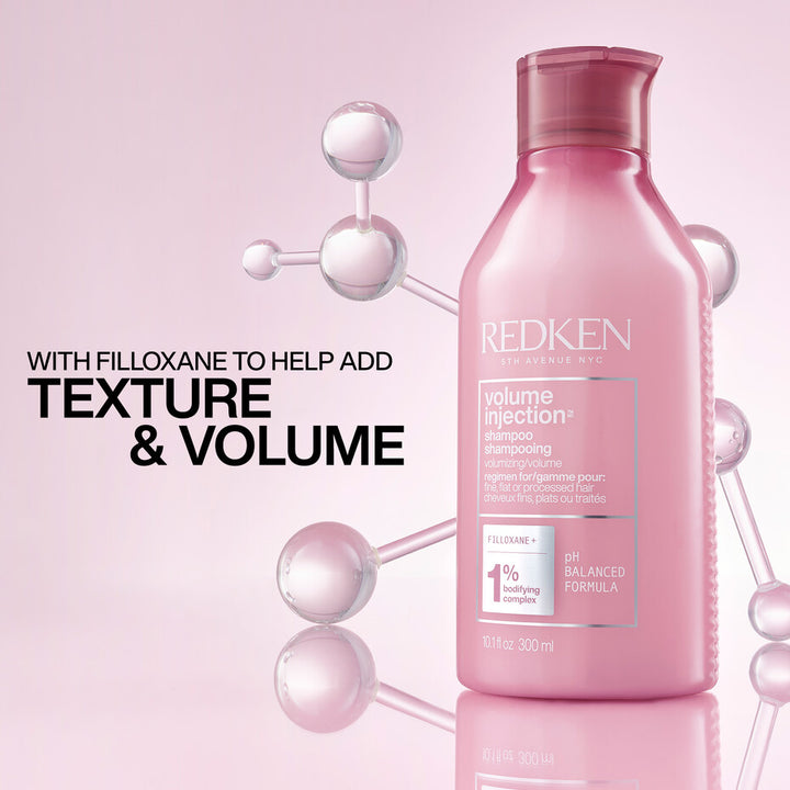 Volume Injection Shampoo është një shampo e lehtë me një formulë teksturë qumështore, e krijuar për të shtuar volum dhe trashësi flokëve të hollë ose atyre që kanë nevojë për më shumë trup dhe formë. Formula e saj e avancuar me Redken’s Bodifying Complex dhe Filloxane ndihmon në trashjen dhe forcimin e flokëve, duke krijuar menjëherë një efekt ngritës nga rrënja dhe një pamje më të plotë. Ky shampo pastron butësisht flokët dhe largon yndyrën e tepërt, pa i rënduar ata, duke siguruar një përfundim me shkëlqim dhe të lëmuar.